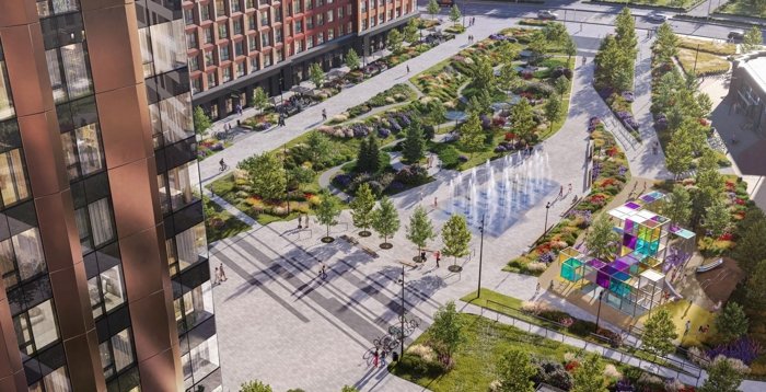 Новый жилой район спроектирован в концепции «двор без машин». На закрытой охраняемой территории разместятся подземные паркинги, зоны для отдыха, дорожки для бега, спортивные площадки и зеленые зоны общей площадью 19,5 га. Жители смогут прогуливаться в центральном парке и по благоустроенной набережной Москвы-реки.